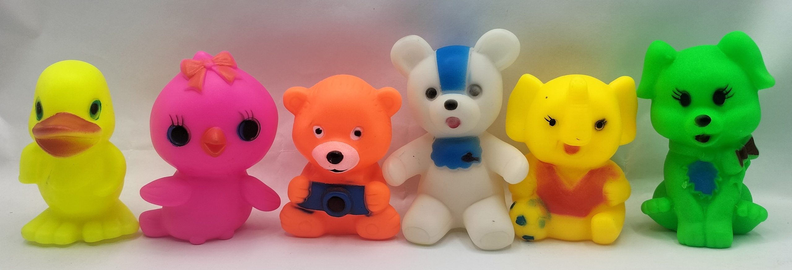 Soft and safe ChuChu squeaky toys for babies and toddlers. Perfect for bath time fun with bright colors and cute characters. Set of 6 sound toys.