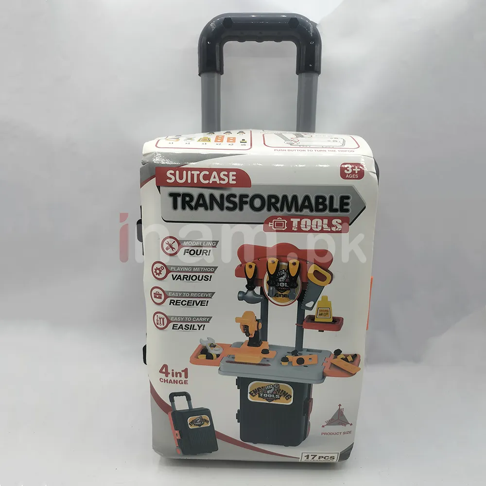 Transformable tool set suitcase that converts into a construction workbench. Portable trolley design with toy tools. Fun and educational builder set.